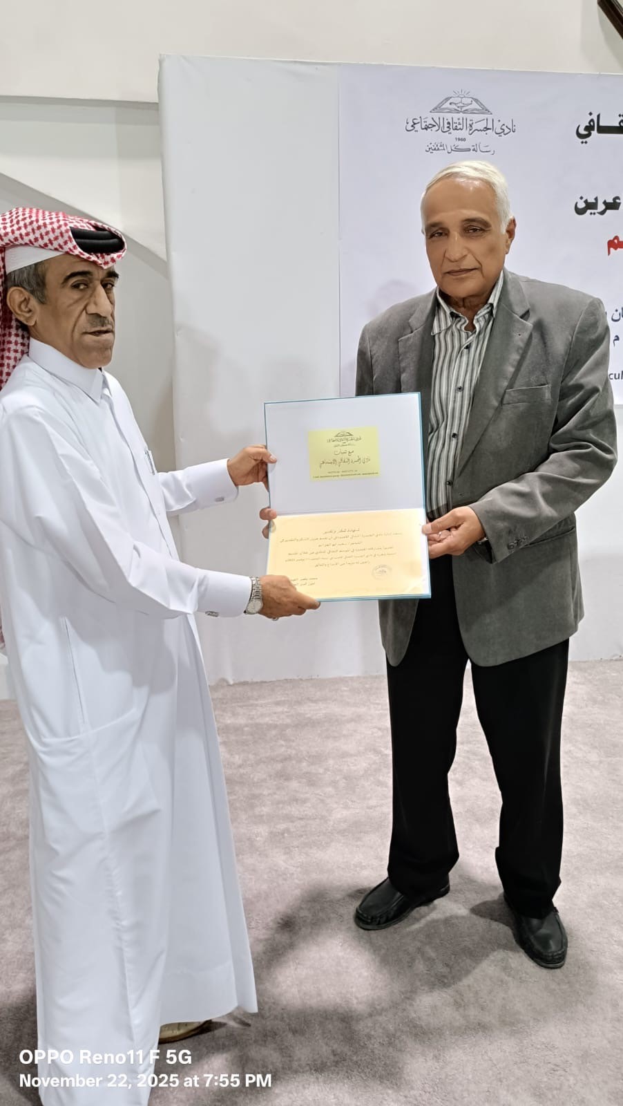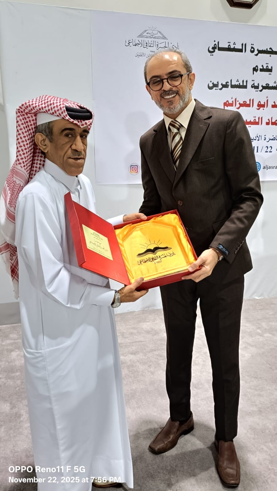 وفي ختام الأمسية، تم تكريم الشاعر عزيز الرسام وعازف العود رأفت بو حمدان والفنان محمد أكدي، حيث قدم السيد محمد سالم الدرويش، عضو إدارة نادي الجسرة الثقافي الاجتماعي، درع النادي وشهادة شكر وتقدير.
