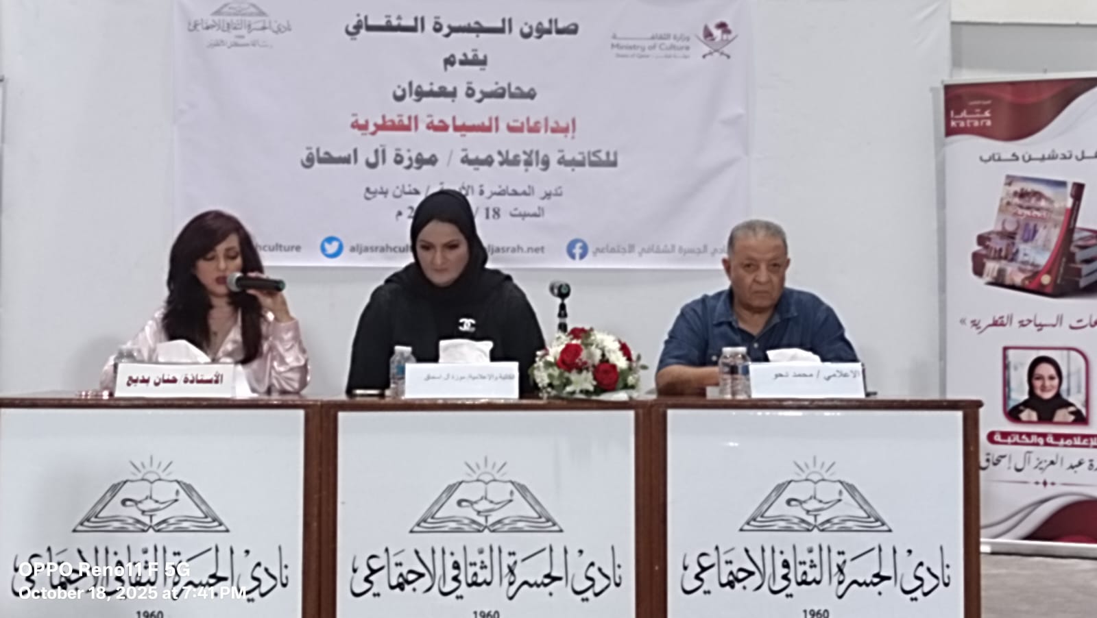 استضاف نادي الجسرة الثقافي الاجتماعي، التابع لوزارة الثقافة، أمسية جديدة بصالون الجسرة الثقافي، ناقش خلالها كتاب “إبداعات السياحة القطرية” للكاتبة والإعلاميةموزة عبدالعزيز آل إسحاق، وذلك بحضور الإعلامي محمد دحو، وأدارت الصالون الأديبة حنان بديع.