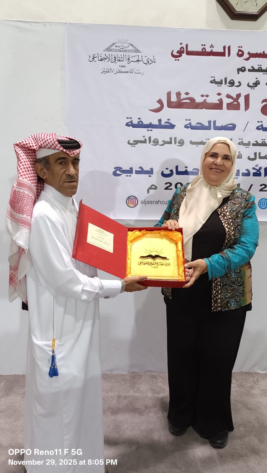 وتُوج اللقاء بتكريم الكاتبين صالحة خليفة، وجمال فايز من قبل إدارة النادي ممثلة بالسيد محمد سالم الدرويش، عضو إدارة نادي الجسرة الثقافي الاجتماعي وتقديم شهادات التقدير والدروع.