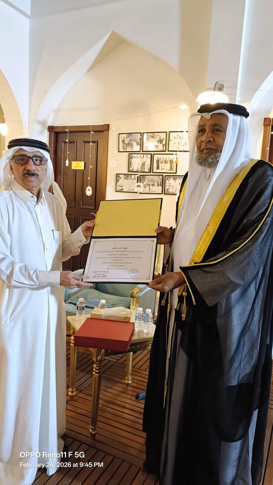 وتُوج اللقاء بتكريم الدكتور أحمد الفرجابي حيث قدم له السيد محمد ناصر العبيدان أمين السر العام بالنادي درع النادي وشهادة شكر وتقدير.